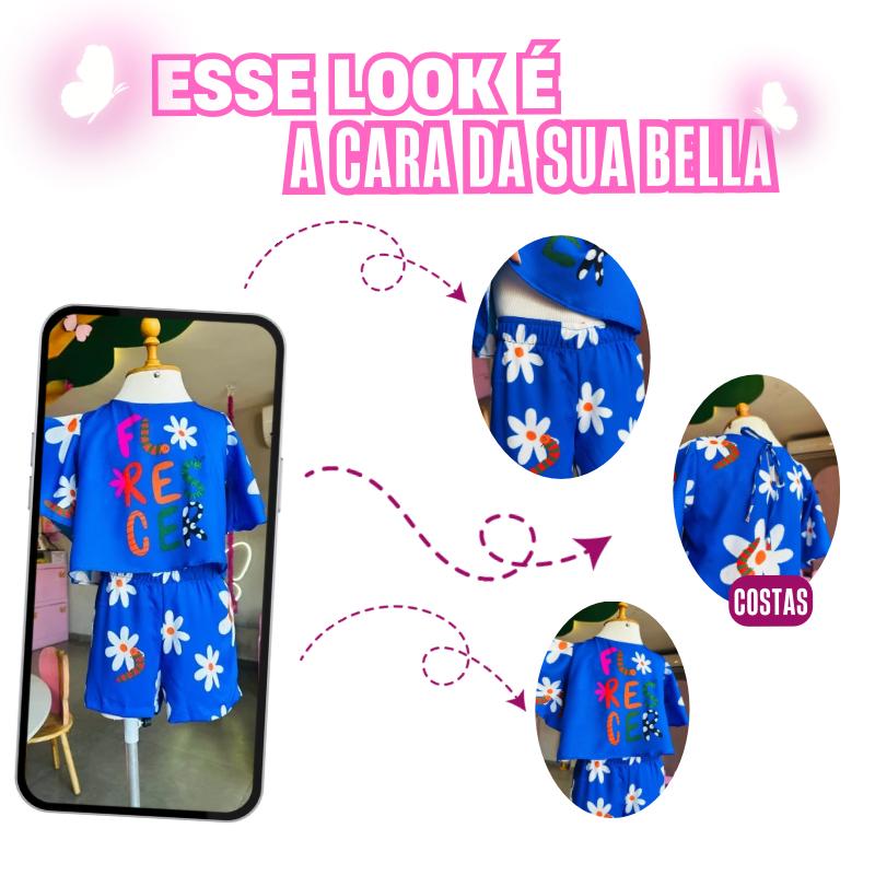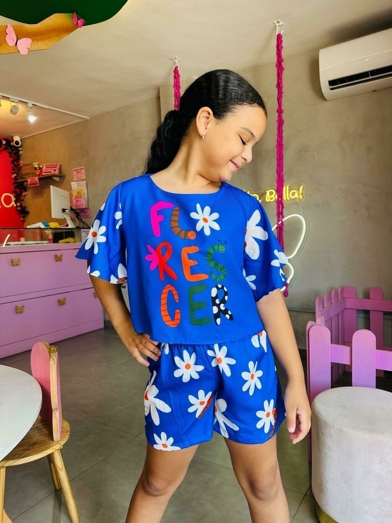 O conjunto é sempre muito prático, a combinação entre parte de cima e parte de baixo faz você estar sempre pronta e evita que se perca tempo pensando em qual look usar. Nosso conjunto Florescer Azul está super em alta. Bem do jeitinho que as nossas Bellas amam! Super fashion com short e blusa estampada que dão todo um charme pra peça. Super versátil, ótimo para combinar com o guardar roupa da sua pequena. Suas peças podem ser usadas separadamente, assim você aproveitará muito mais o look.