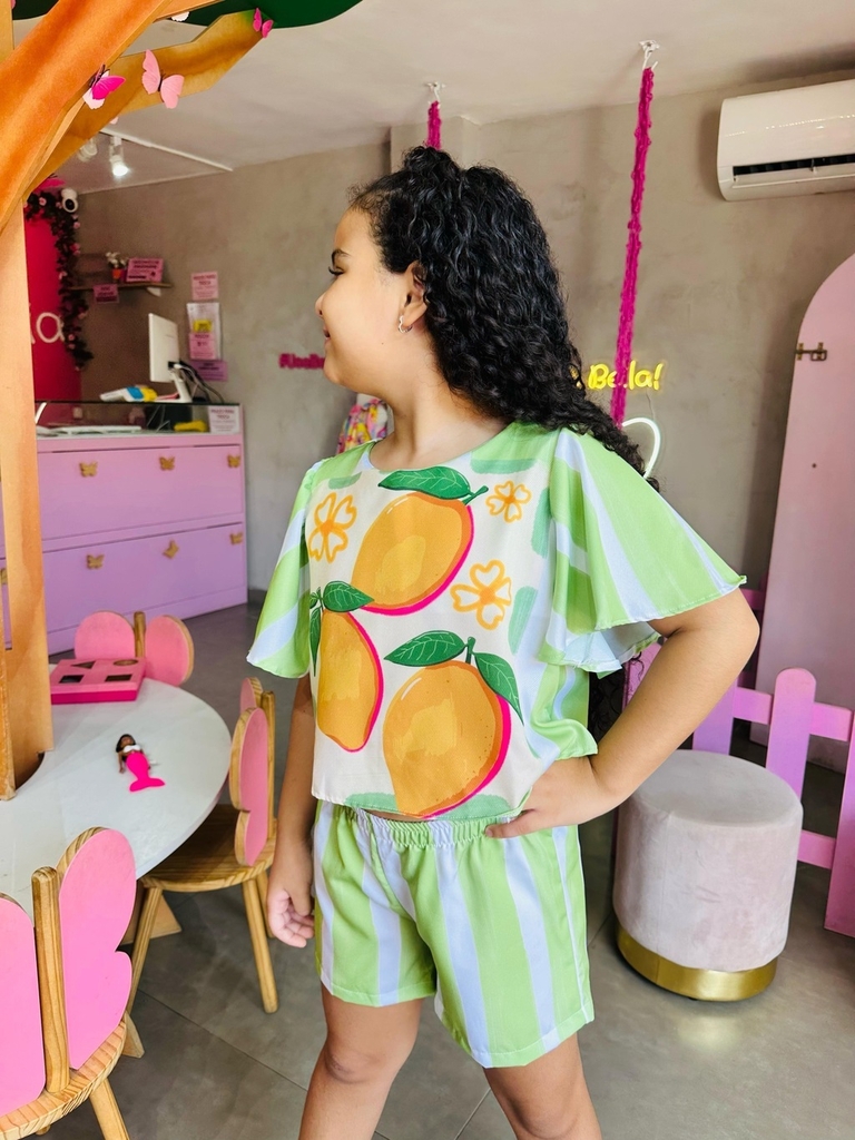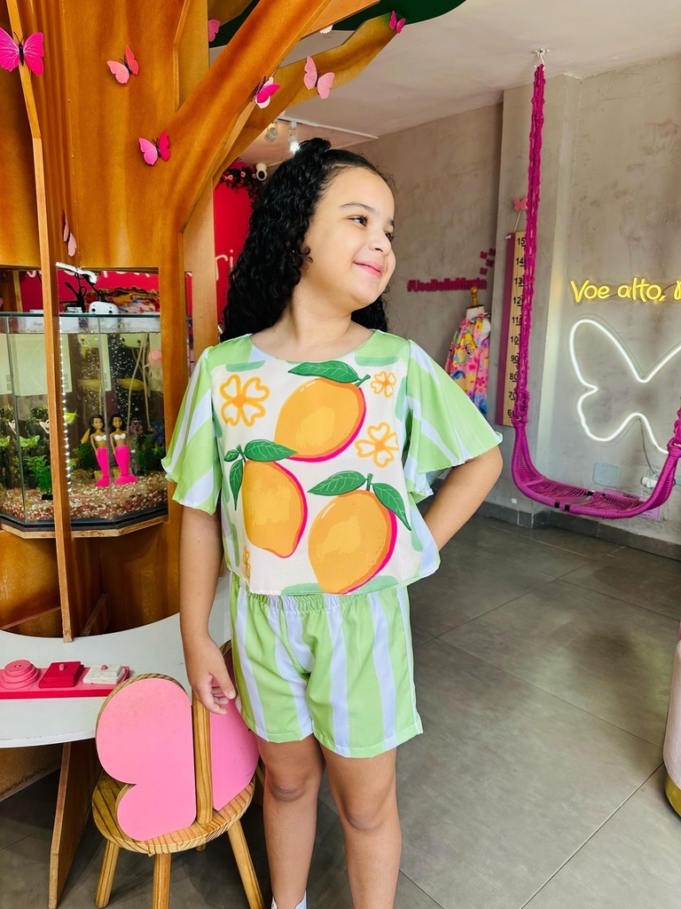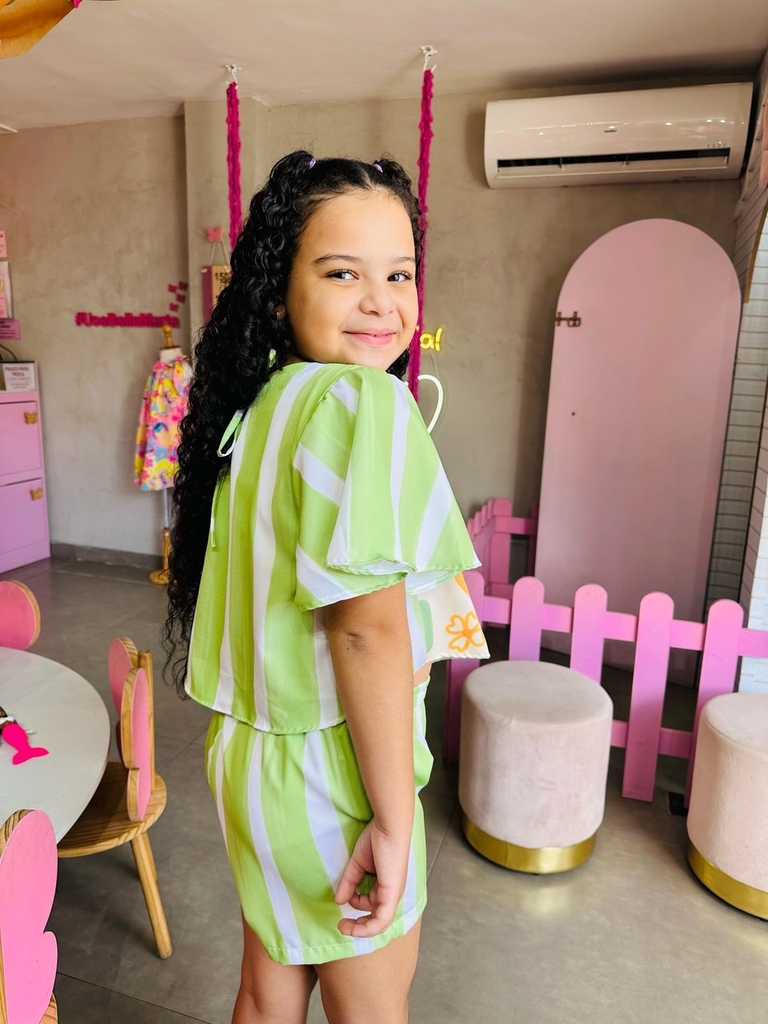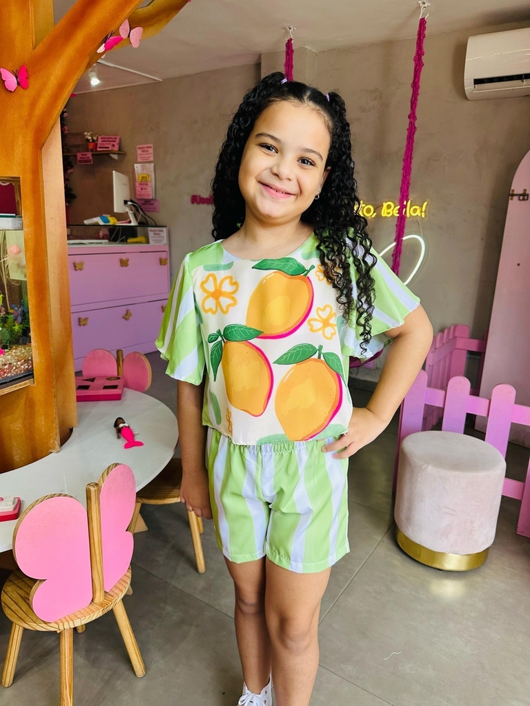 O conjunto é sempre muito prático, a combinação entre parte de cima e parte de baixo faz você estar sempre pronta e evita que se perca tempo pensando em qual look usar. Nosso Conjunto Limão Listra está super em alta. Bem do jeitinho que as nossas Bellas amam! Super fashion com short e blusa estampado que dão todo um charme pra peça. Super versátil, ótimo para combinar com o guardar roupa da sua pequena. Suas peças podem ser usadas separadamente, assim você aproveitará muito mais o look.